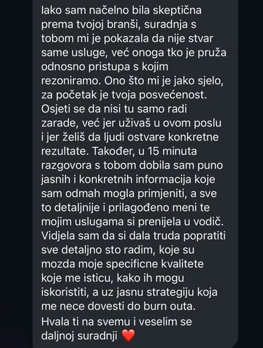 Ne vjerujem da "samo objavljivati" dovoljno, vjerujem u jasnu poruku, pozicioniranje i sadržaj koji ti gradi reputaciju. Pomoći ti da izvučeš ono najbolje iz sebe, pretvoriš ga u osobni brend i pokažeš ga online na način koji ti je prirodan.