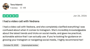 Moj fokus nisu estetični profili, nego osobni brend koji ima glavu, rep i jasnu strategiju. Zajedno definiramo tko si kao brend, koja je tvoja priča, za koga pričaš i kako da tvoji profili to stvarno odražavaju.